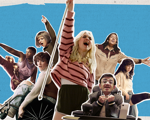 在弹奏钢琴的学生身后,舞者们翩翩起舞:一名单腿舞者借助前臂拐杖表演脚尖旋转;一名金色长发舞者快速转圈;还有一名穿高领毛衣的舞者坐在轮椅上旋转。学生们坐在座位上观看表演。一名学生使用 iPad 上的实时字幕功能,歌词随着音乐同步显示。单腿舞者抬腿跳跃起来,并用手轻拍脚尖。镜头来到一个室内派对,一名穿着牛仔夹克的学生揽住一名身穿银领衬衫、坐在电动轮椅上的学生,做出将她轻轻往后一放的舞蹈动作。
