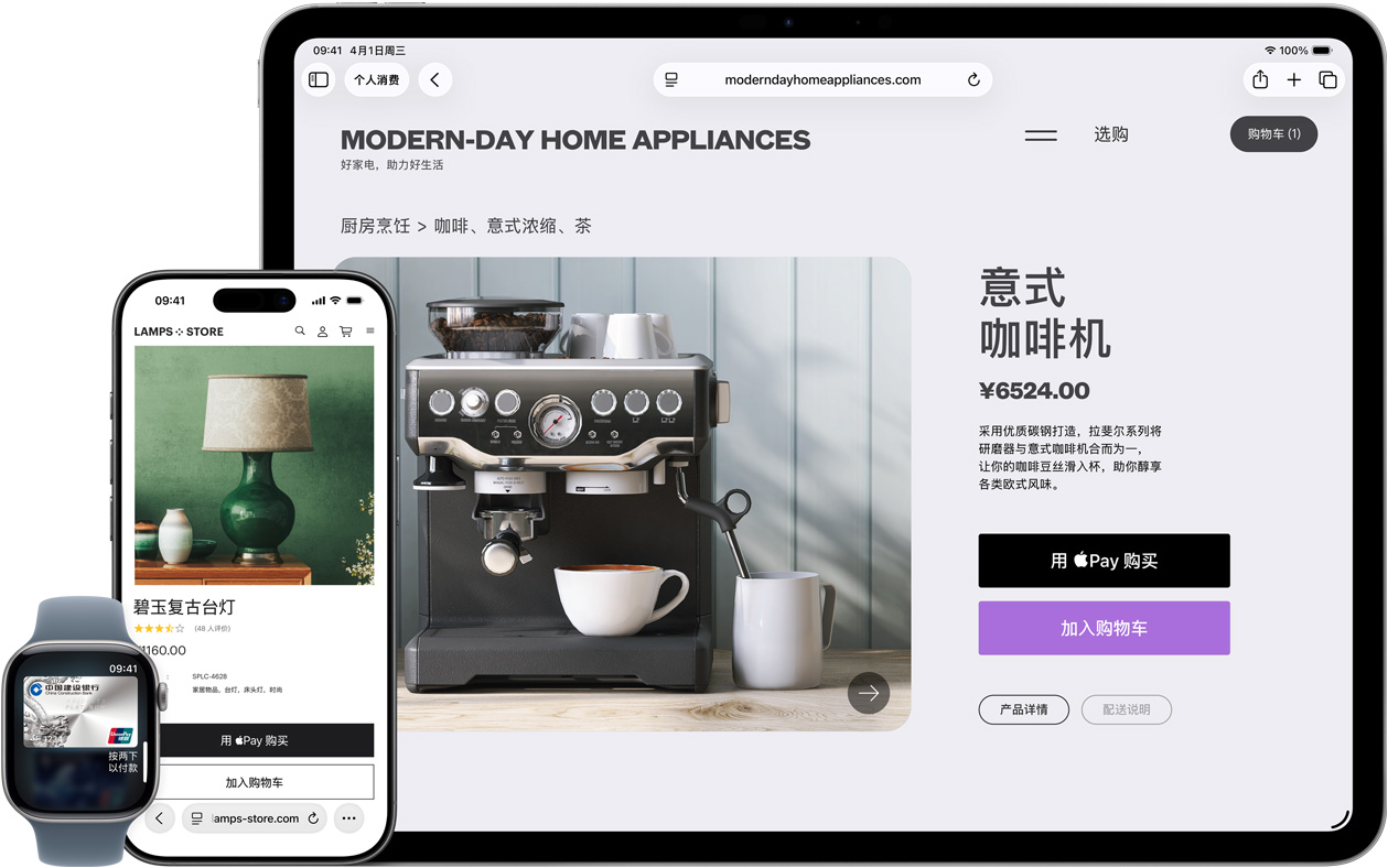 在线支付很便捷。你可以用 iPhone 或 iPad,在各类 app 内或是指定网页2上使用 Apple Pay 进行下单。无论是打车、点外卖,还是买双新球鞋,都能快速、轻松又安全地完成付款。
