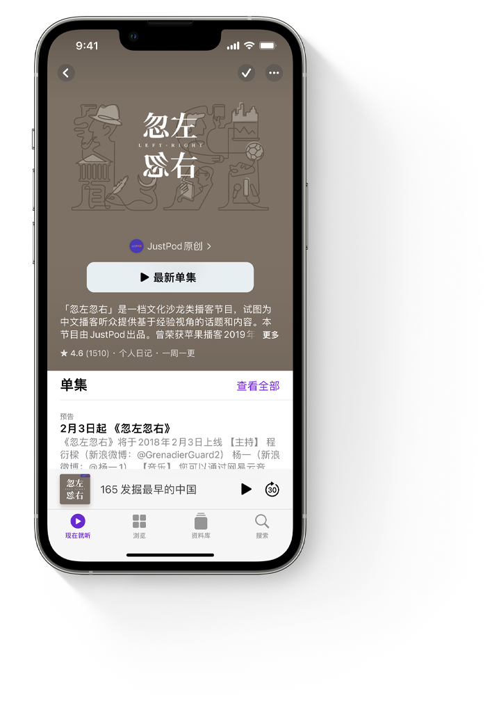 Apple 播客是你查找、关注和聆听各种热门播客节目的好去处。还有编辑精选和个性化推荐,让你轻松发现新节目。