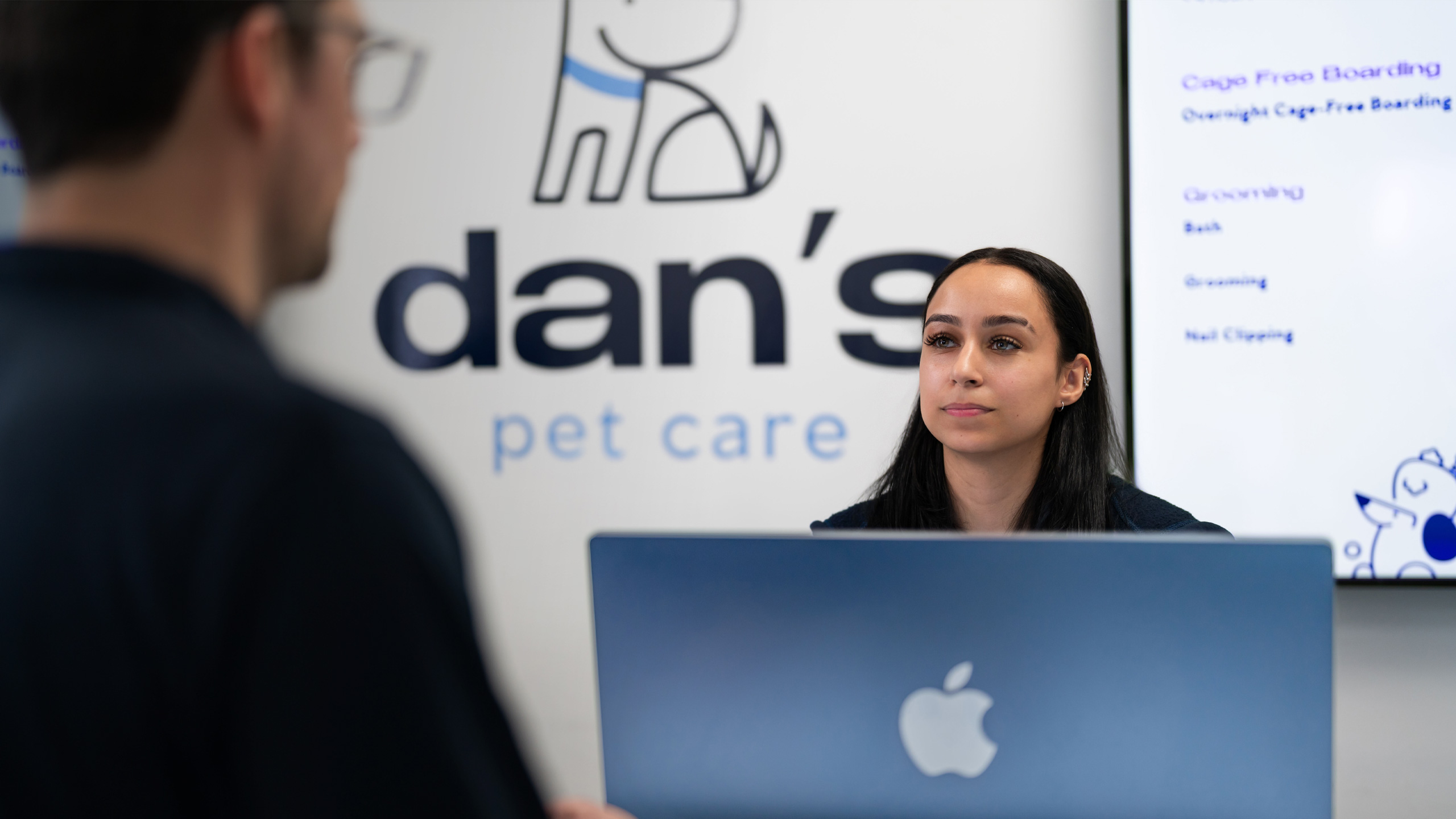 iMac 是 Dan’s Pet Care 实体门店的必备装备。前台处色彩缤纷的 iMac 电脑将品牌个性展露无疑,顾客一进门就能感受到热情友好的氛围。团队使用 Mac 来运行 Gingr app,能在现场管理日托与寄养服务,实时追踪每只宠物的个性化护理情况。