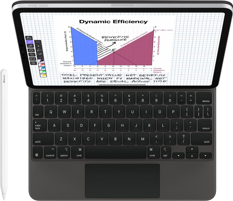 iPad Pro 和 Apple Pencil 让 Gopalakrishnan 博士的课堂变得耳目一新。她使用 iPad 上的 Explain Everything Whiteboard 来记录和录制她的环境经济学课程,还会拿起 Apple Pencil 随手写下对抽象图标的解析,向学生们示范如何当场解决复杂的数学难题。