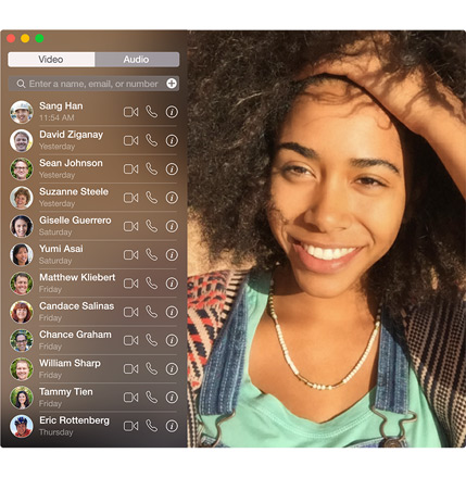 在 Mac 上设置 FaceTime 十分简单。你只须要一个 Apple ID 和邮箱地址就可进行。要与好友开始视频通话,在通讯录列表中找到她的联系人信息即可。FaceTime 可与通讯录无缝协作,让你不必重新输入联系人信息。如果你想呼叫好友的 iPhone,只须点击她的电话号码。若要呼叫对方的 iPad、iPod touch 或 Mac,你可以使用其邮箱地址。接着一条邀请会在她的屏幕上弹出,对方一旦接受邀请,视频通话即可开始。这样,你就能通过 Mac 连接 iPad、iPhone、iPod touch 或 Mac,与朋友面对面交谈。