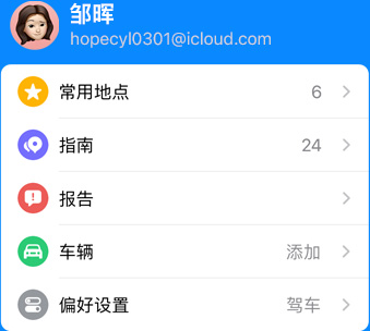 你只需打开地图 app ,轻点屏幕底部的账户头像,即可集中查看自己常用的设置选项,包括首选的交通方式、已报告的问题和常用地点。当你在设备上或配备 CarPlay 车载的汽车仪表盘上打开地图 app,轻点一下,就能查看家、公司、健身房、孩子学校、附近加油站、喜爱的餐厅等常用地址。