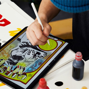 在位于布鲁克林的工作室内,艺术家 Eric “Efdot” Friedensohn 正在为下一个项目设置自己的工具。该项目需要他在自己大胆、鲜明的标志性艺术风格内,融入一点怀旧情怀。他在桌旁坐下,拿起 iPad Pro 和 Apple Pencil 开始进行创作。