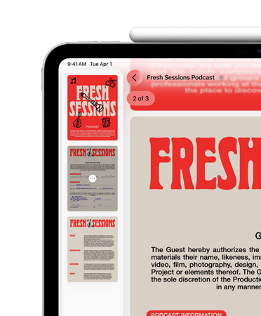 向左或向右轻轻一拨即可自如调整窗口布局。现在你还可将 iPad 屏幕界面分成三等分或四等分。