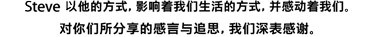 100 多万来自世界各地的人们,分享了彼此对 Steve 的感怀、感念以及感受。无论是朋友、同事还是 Apple 产品的用户,都被 Steve 的热情和创造力所深深触动。如下是他们的感言,也请将你想说的发送电子邮件至 rememberingsteve@apple.com。